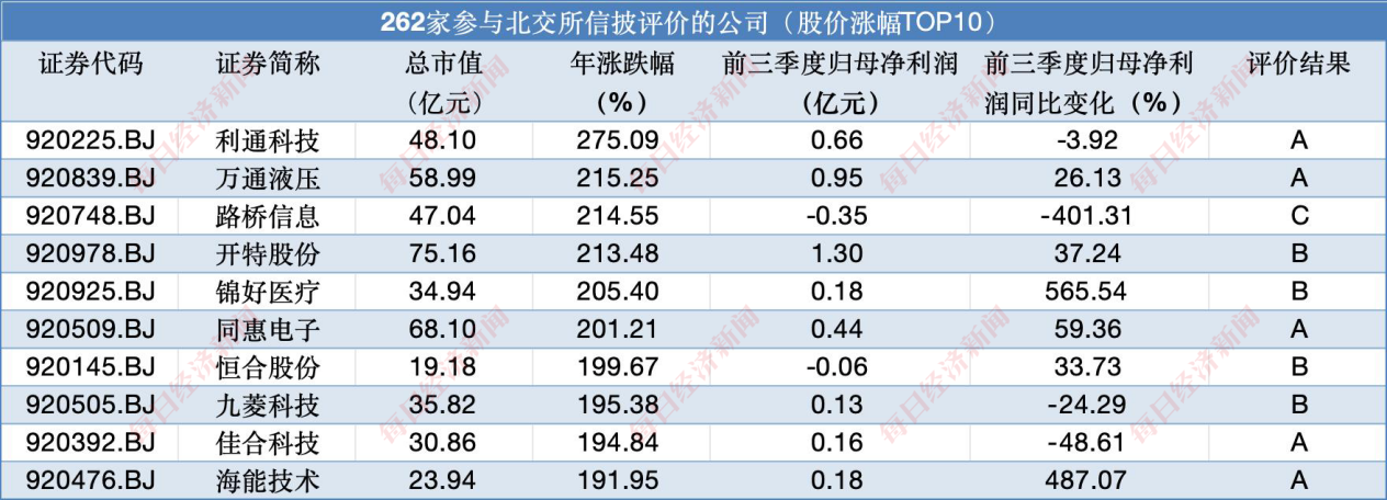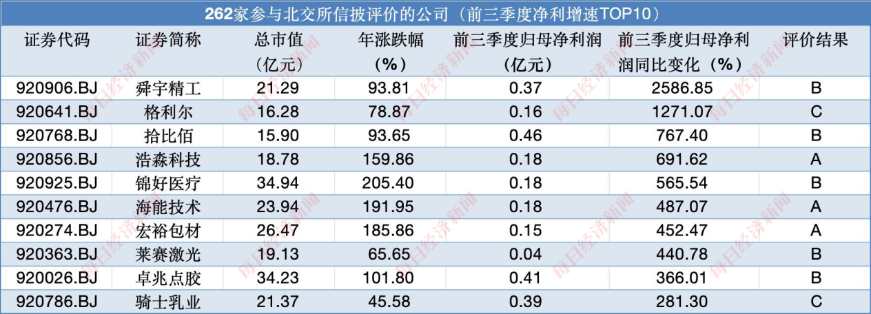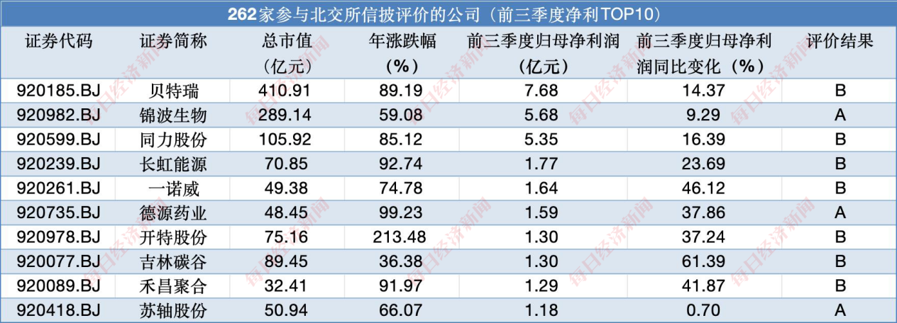 《每日经济新闻》 记者根据 Wind 数据统计了此次参评的 262 家北交所公司发现,市值 TOP10 中,有 5 家获评 A,5 家获评 B。