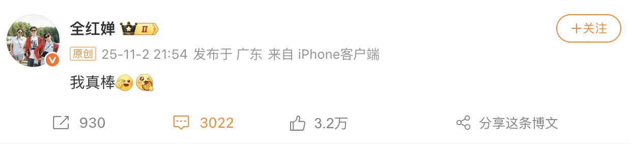 11 月 2 日晚,全红婵在社交媒体上发文:「我真棒」。
