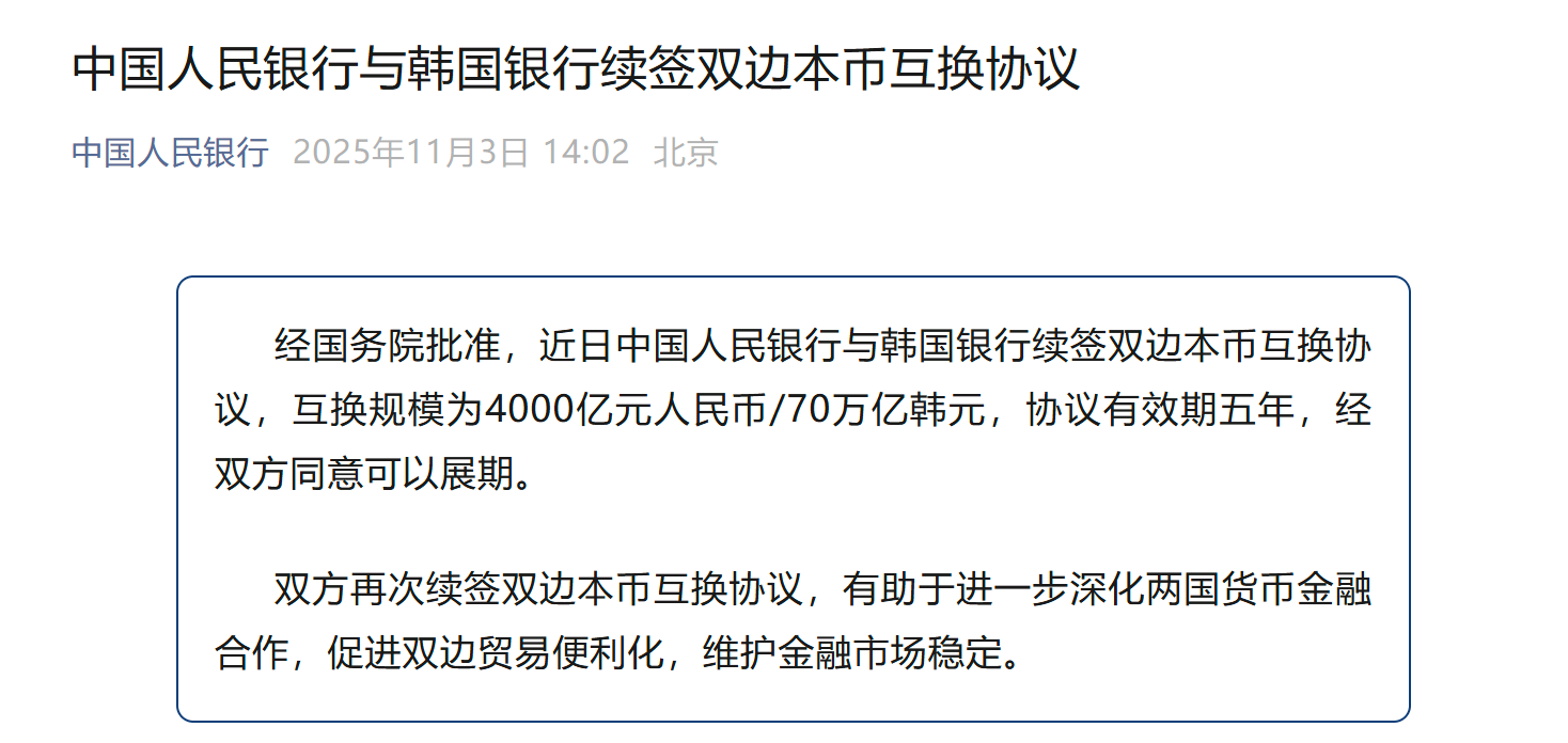 11 月 3 日,据中国人民银行官方披露,经国务院批准,近日中国人民银行与韩国银行续签双边本币互换协议,互换规模为 4000 亿元人民币/70 万亿韩元,协议有效期五年,经双方同意可以展期。