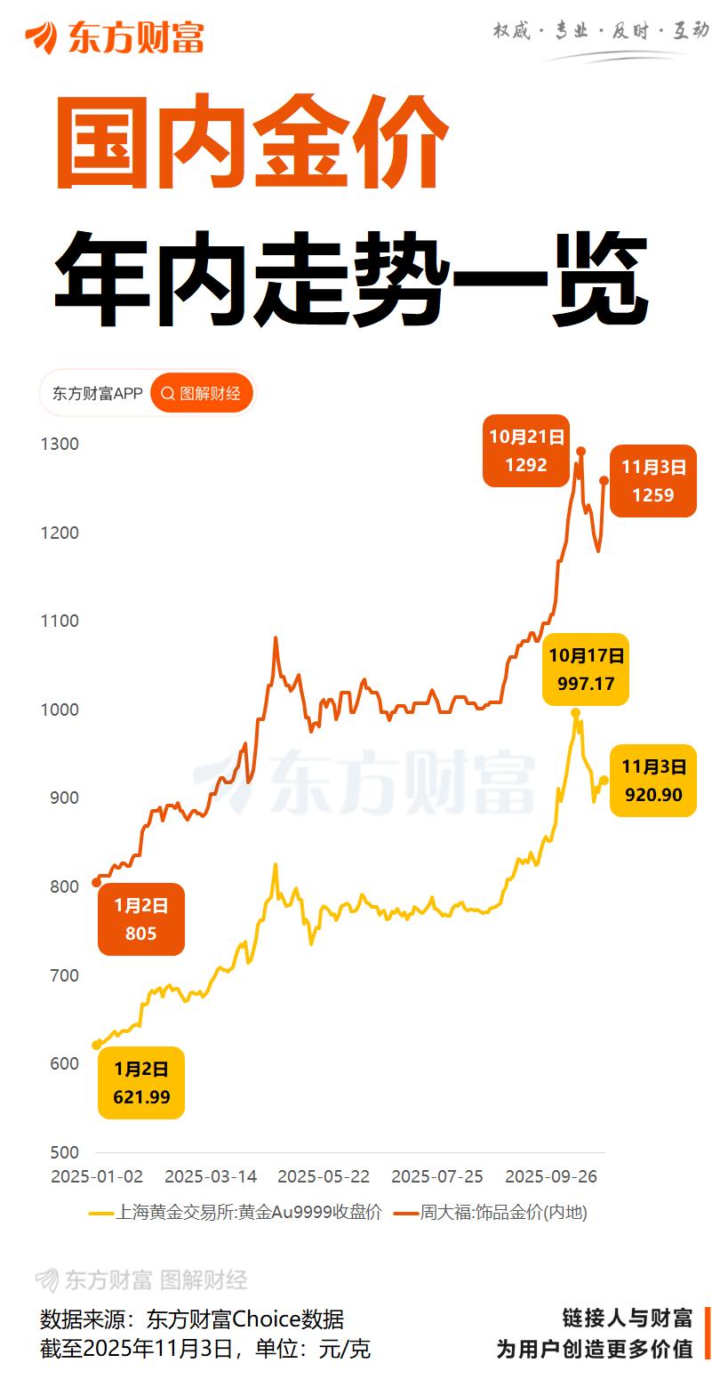 国内品牌金饰价格随之调整。老庙黄金足金饰品报价 1256 元/克,较前一日 1193 元/克上调 63 元/克,单日涨幅 5.28%;周生生报价 1255 元/克,较前一日 1193 元/克上调 62 元/克,单日涨幅 5.20%;周大福报价 1259 元/克,单日涨幅 5.09%;六福珠宝报价 1259 元/克,单日涨幅 5.09%。