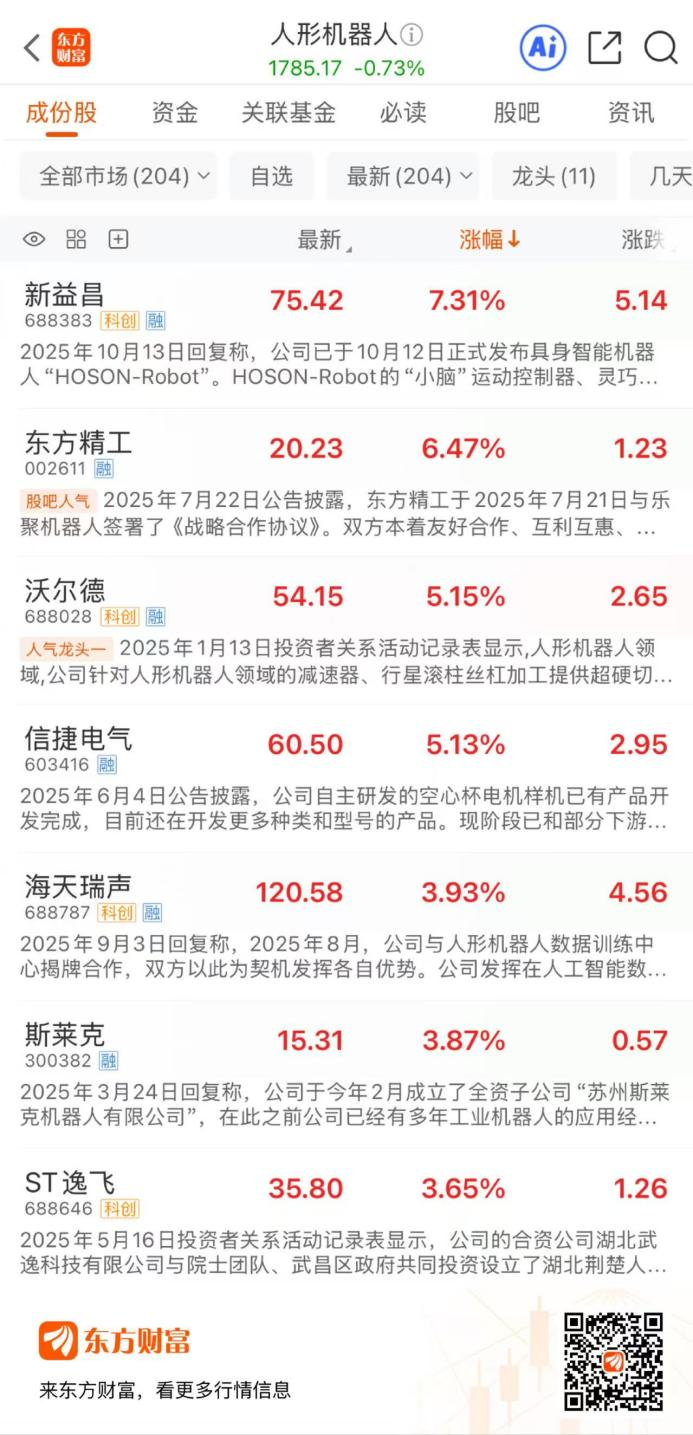 11 月 3 日早盘,人形机器人概念多股异动,截至发稿,新益昌涨超 7%,东方精工涨超 6%,沃尔德、信捷电气涨超 5%,海天瑞声、斯莱克、ST 逸飞、上海电气、精工科技、九鼎投资等多股涨超 3%。