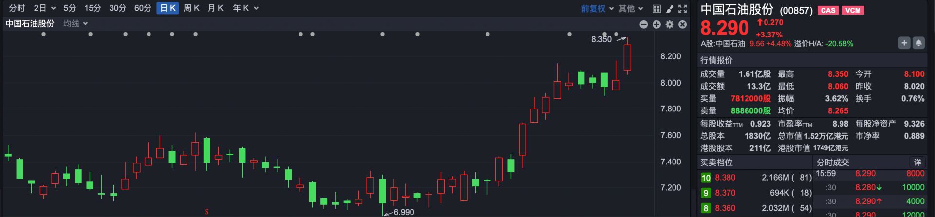 板块上,今日煤炭股涨幅领先。其中,兖矿能源 (01171.HK)、中煤能源 (01898.HK) 涨超 4%,中国神华 (01088.HK)、首钢资源 (00639.HK) 涨超 2%。此外,石油股表现强势,多只石油股创出近期新高。其中,中国石油股份 (00857.HK)、中国海洋石油 (00883.HK) 涨超 3%,中国石油化工股份 (00386.HK)、中石化炼化工程 (02386.HK) 涨超 2%。