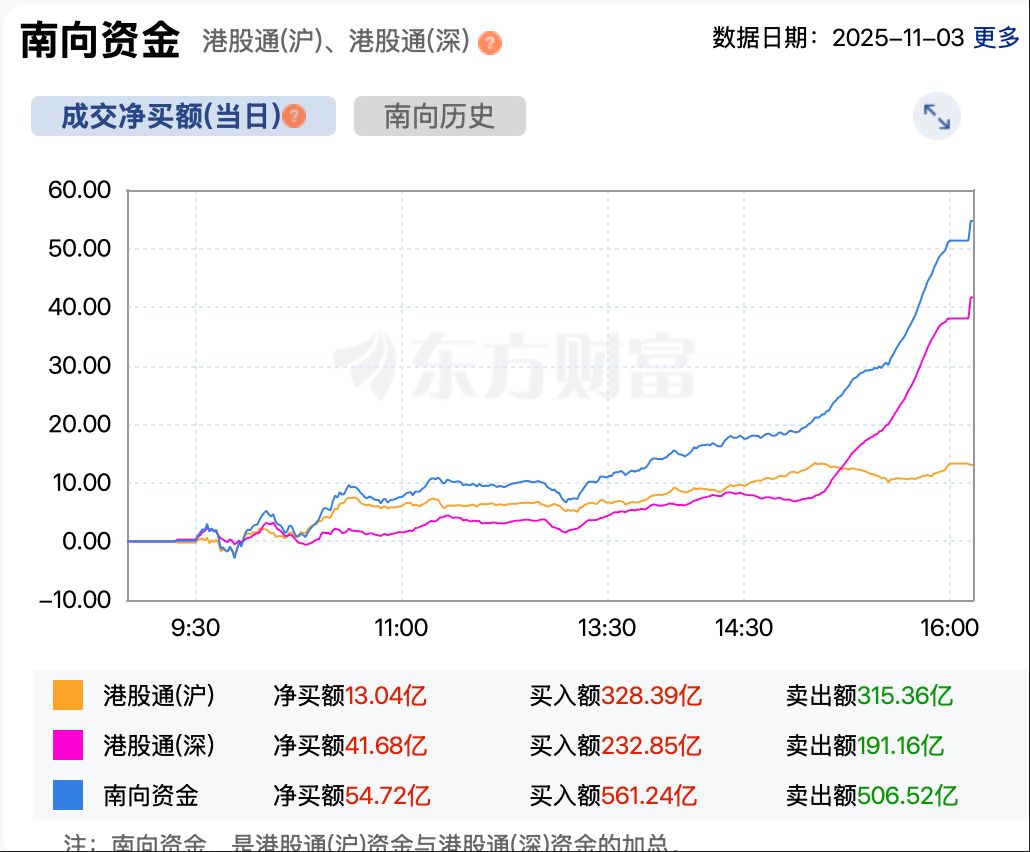 资金方面,截至收盘,南向资金净买入港股金额超 54 亿港元。