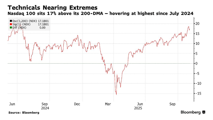 亚德尼表示,在标普 500 指数实现约 17 万亿美元的反弹后,关键市场技术指标正接近历史极值:标普 500 指数较 200 日均线高出至多 13%,如此大的偏离度传统上意味着涨势已过度延伸。纳斯达克 100 指数 (NDX) 较长期支撑位高出 17%,接近 2024 年 7 月以来的最大偏离度——在去年 7 月之后,8 月日元套利交易引发市场动荡,股市随即出现抛售。