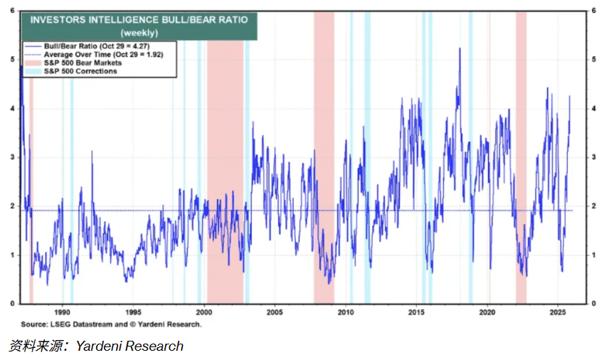 从一项指标来看,投资者当前的看涨情绪达到一年来最高。亚德尼研究公司的分析显示,在投资者情报 (Investors Intelligence) 对通讯作者进行的截至 10 月 29 日当周的调查中,看涨者与看跌者的比例升至 4.27——突破了 4.00 这一历史上标志情绪过度狂热的阈值。另一项显示乐观情绪升温的信号来自美国个人投资者协会 (AAII) 的周度散户调查:过去 7 周中,看涨情绪有 5 次超过 37.5% 的历史均值。