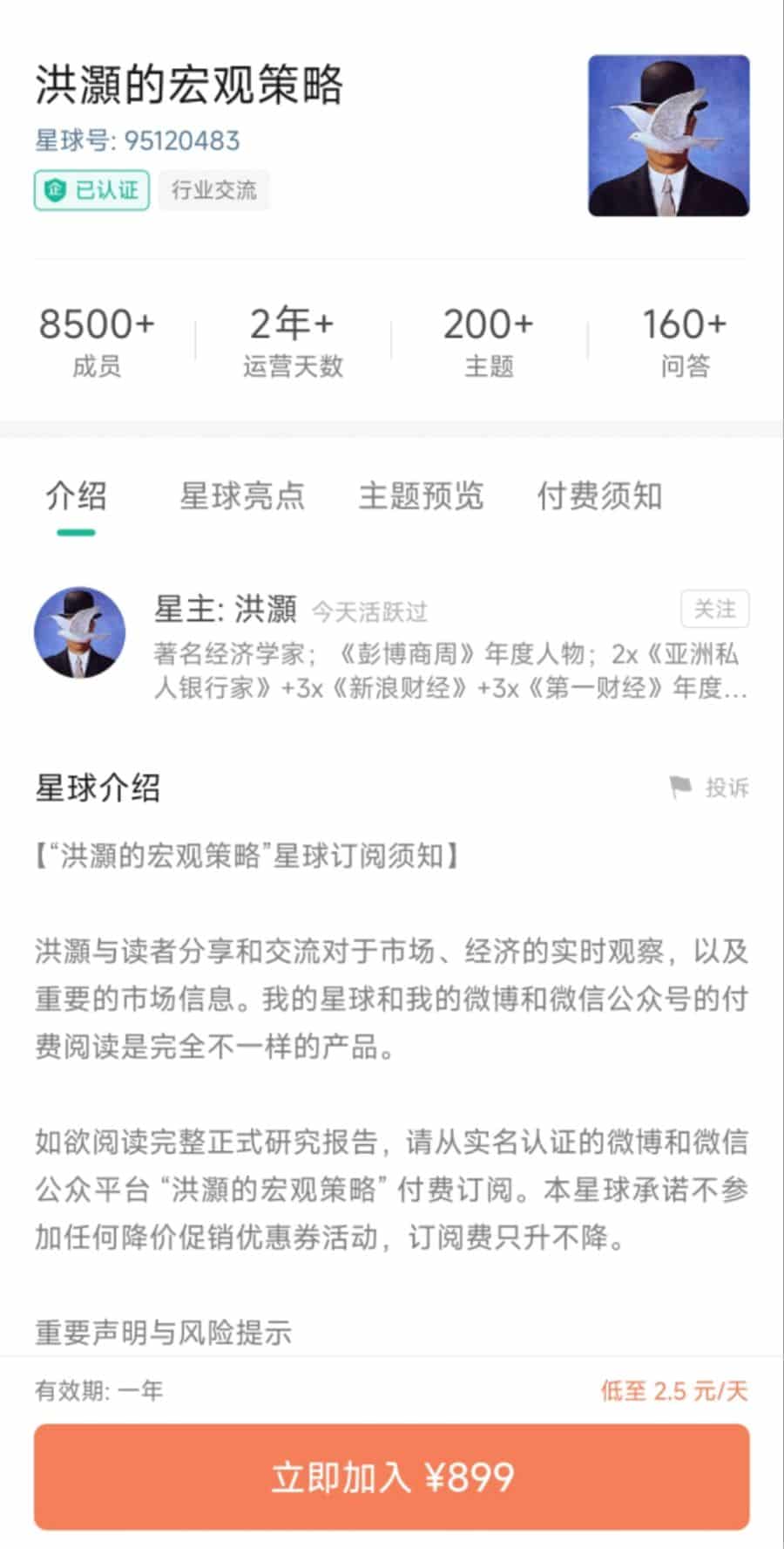 知名经济学家刘煜辉是较为早期的实践者之一。其知识星球运营时间已超 7 年,内容以宏观经济和趋势分析观点为主。截至目前,该星球已吸引了超过 9900 位用户付费加入,当前定价为 488 元/年。公开资料显示,刘煜辉曾先后担任华泰证券、广发证券和天风证券的首席经济学家。