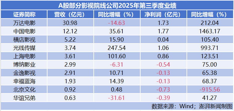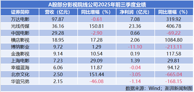 此外,院线公司金逸影视(002905.SZ) 前三季度净利润翻倍,幸福蓝海(300528.SZ) 大幅减亏。