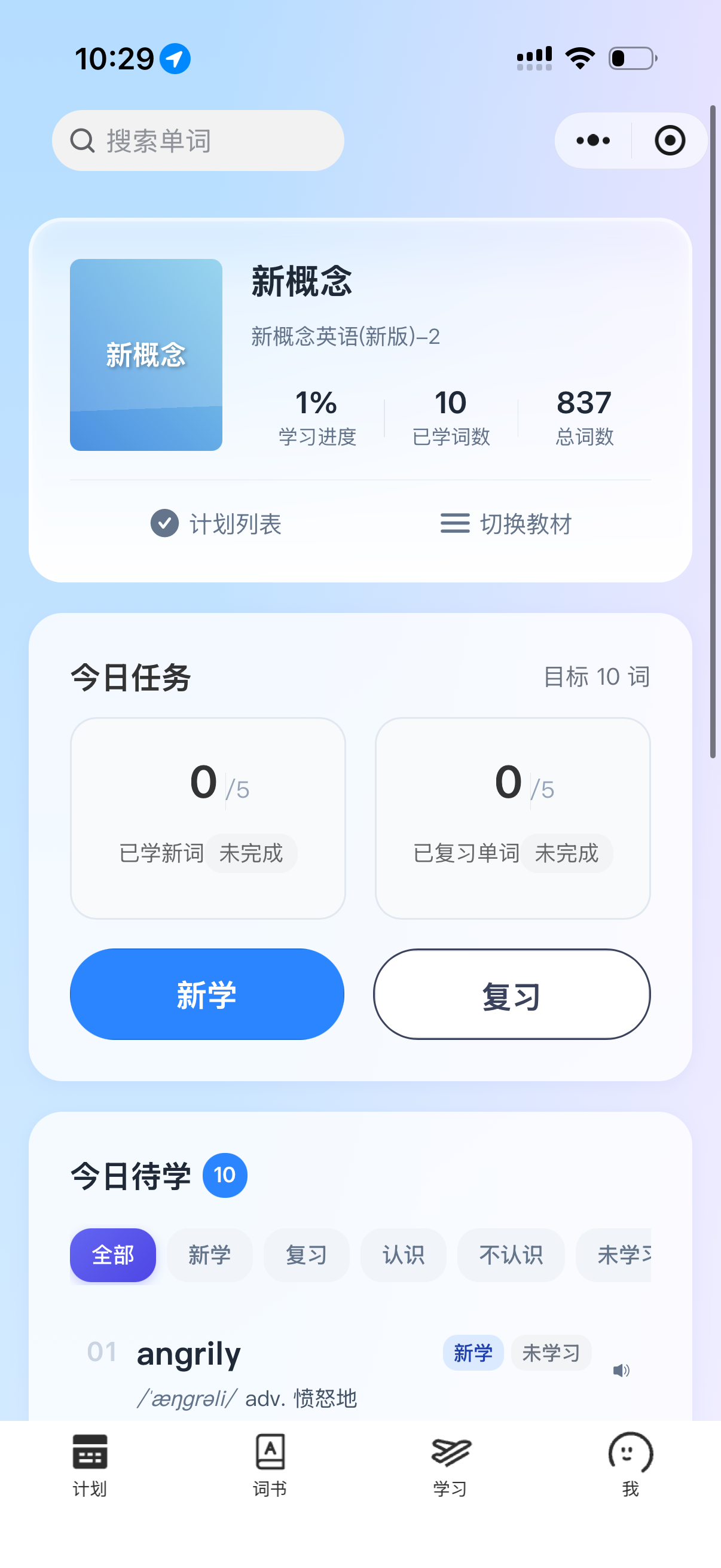 - 开学习:从 「新学」 开始,跟读发音、熟悉例句;再切 「复习」,在系统安排的时机巩固。
