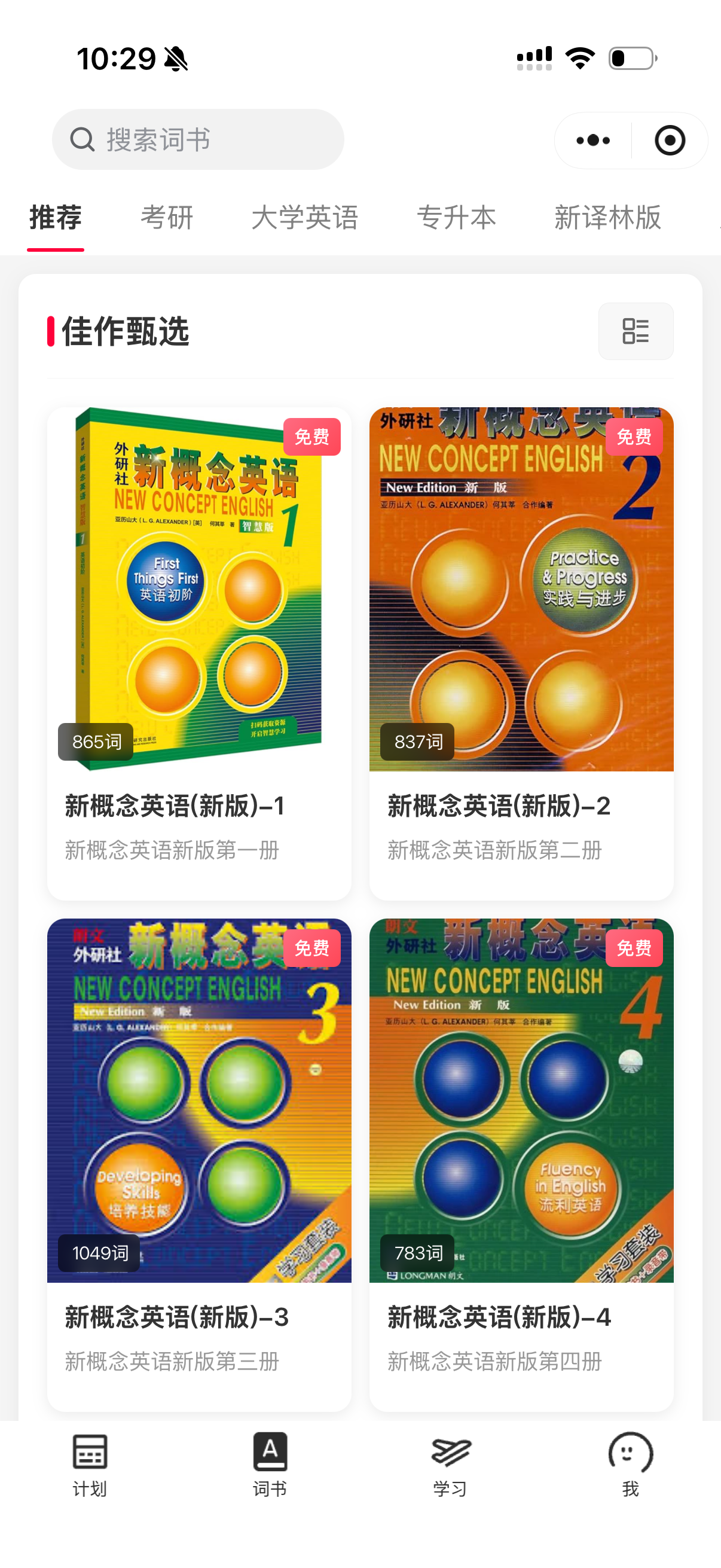 - 使用建议:直接根据自身水平选择词书并创建计划;每日按系统安排完成 「新学 + 复习」。