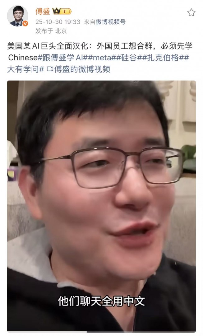 【】11 月 4 日消息,「硅谷的一家知名 AI 企业里,外籍员工发现想要融入核心团队,掌握中文正变得前所未有地重要 「。近日,猎豹移动首席执行官傅盛在社交平台分享上述观察。