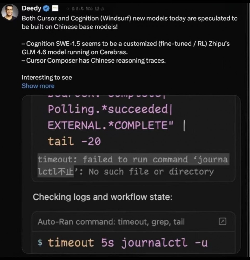 也在上周,另一家 AI 编程独角兽 Cognition 也推出了最新 AI 模型 SWE-1.5。有人对 SWE 1.5 进行了大模型 「越狱」,结果模型直接回答自己是智谱 AI 开发的 GLM 大模型。