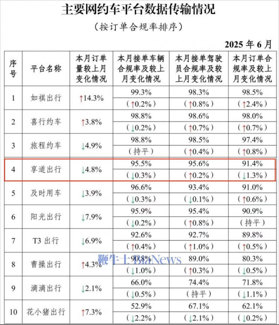 另外,《次世代车研所》 栏目从交通运输部公布的数据看到,今年上半年,享道出行在一些月份的订单合规率也在下降。今年 5 月,享道出行的订单量环比下降 6.4%,订单合规率也下降了 1.9%;今年 6 月,享道出行的订单量环比下降 4.8%,订单合规率下降 1.3%。
