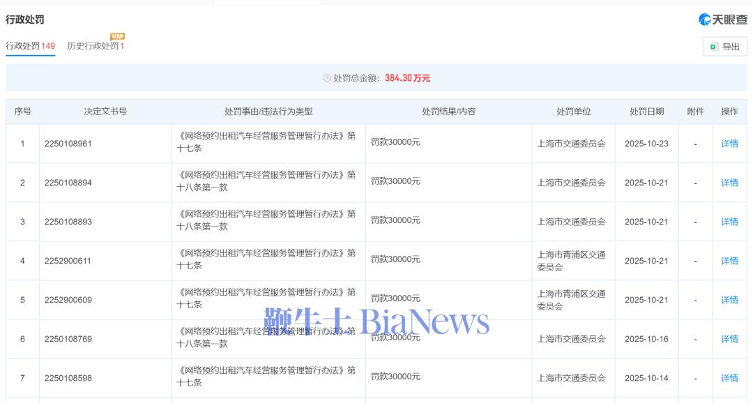 天眼查显示,享道出行的运营主体享道出行 (上海) 科技股份有限公司累计遭遇行政处罚共 149 条,处罚总金额为 384.3 万元,大多数处罚的原因为司机或者车辆不合规。