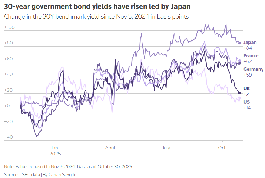 日本国债涨幅更为激进,30 年期收益率上涨近 85 个基点至纪录高位;法国与德国 30 年期国债收益率自 2024 年 11 月 5 日以来分别上升 62 和 59 个基点。