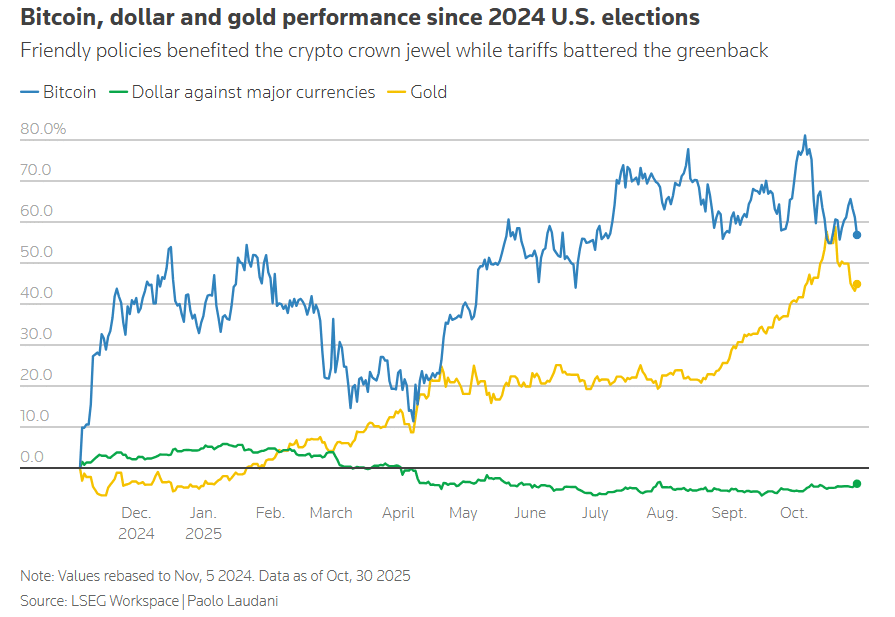 自特朗普当选美国总统一年来,全球金融市场不得不应对政策冲击、前所未有的不确定性及剧烈波动,股市、黄金与加密货币纷纷创下历史新高。