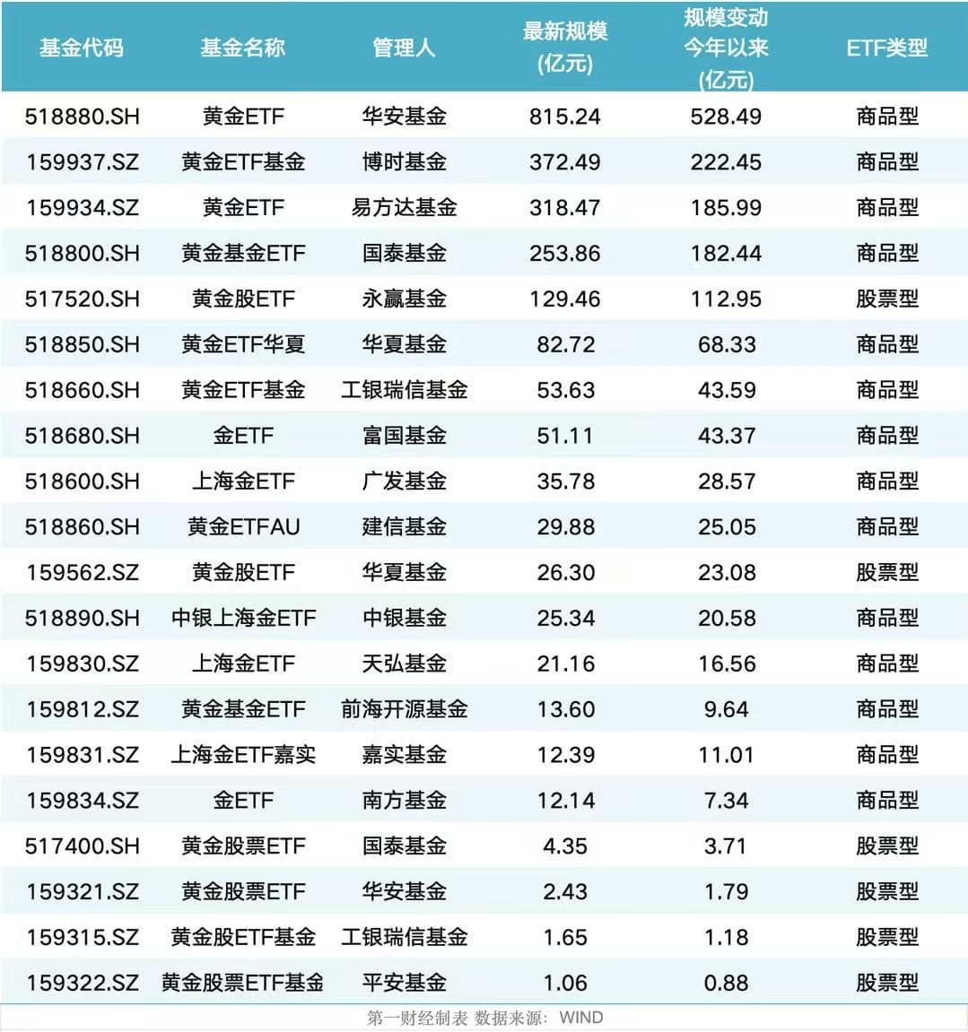 不过,产品间规模分化依然严重。目前,华安黄金 ETF(518880.SH) 以约 815 亿元规模稳居榜首,较年初大幅增加了 528 亿元;博时黄金 ETF(159937.SZ)、易方达黄金 ETF(159934.SZ) 分别以总规模约 372 亿元、318 亿元位列第二、三位,分别较年初增加了 222 亿元、186 亿元左右;国泰、华夏类似产品规模也分别增至 254 亿元、83 亿元。同期,多只黄金 ETF 规模在 15 亿元以下。
