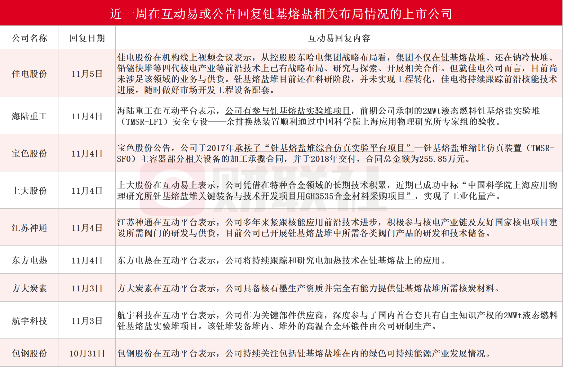 来源: 财联社 近日,由中国科学院上海应用物理研究所牵头建成的2兆瓦液态燃料钍基熔盐实验堆首次实现钍铀核燃料转换。截至收盘,有参与钍基熔盐实验堆项目的海陆重工斩获3连板。据财联社不完全统计,截至发稿,包括佳电股份、海陆重工、宝色股份、上大股份、江苏神通、东方电热、方大炭素、航宇科技和包钢股份在内的9家A股上市公司近一周在互动易或公告回复钍基熔盐相关布局情况。其中,佳电股份今日发布机构线上视频会议表示,控股股东哈电集团在钍基熔盐堆等四代核电产业上已有战略布局。(财联社) 文章转载自东方财富