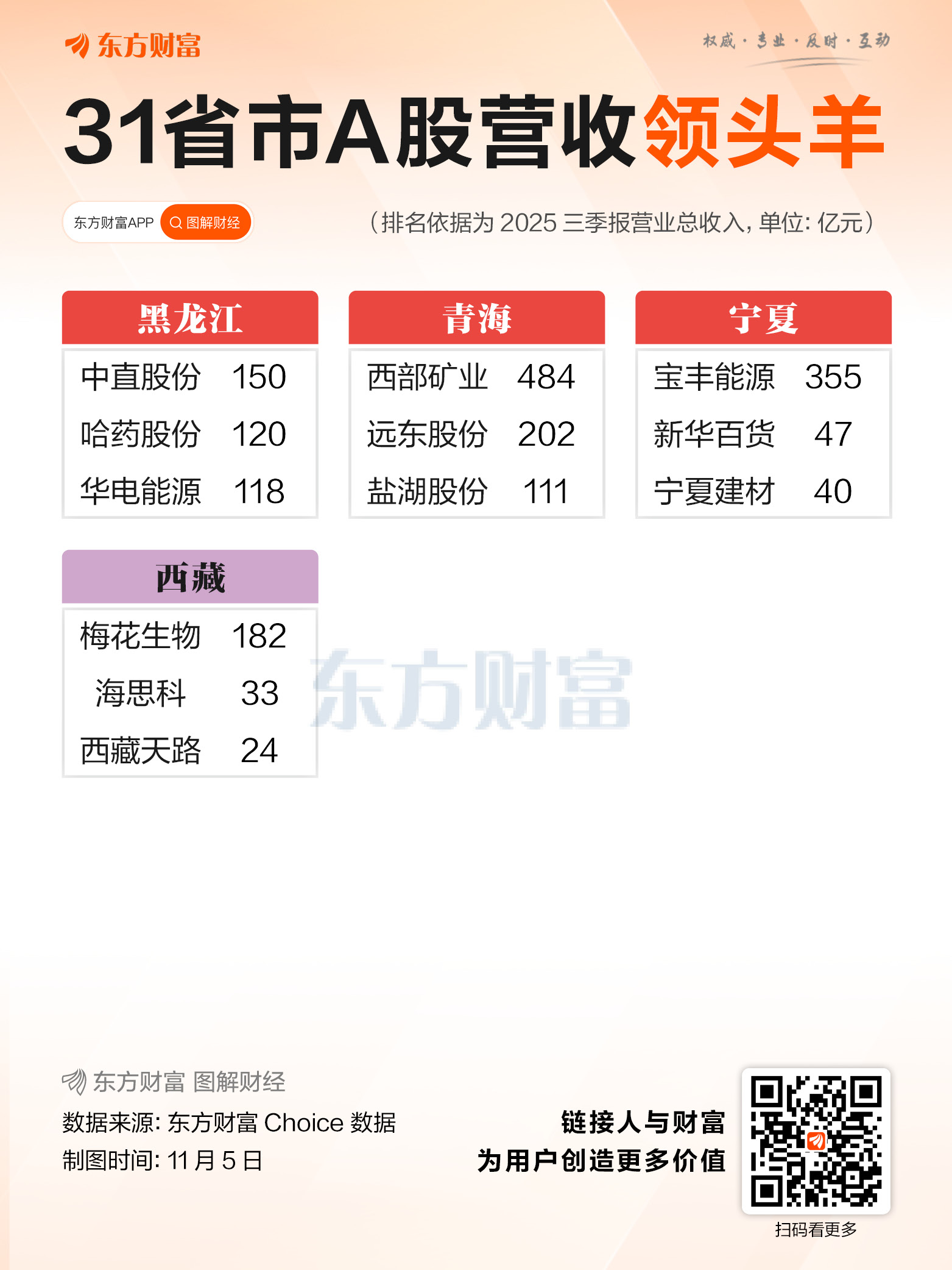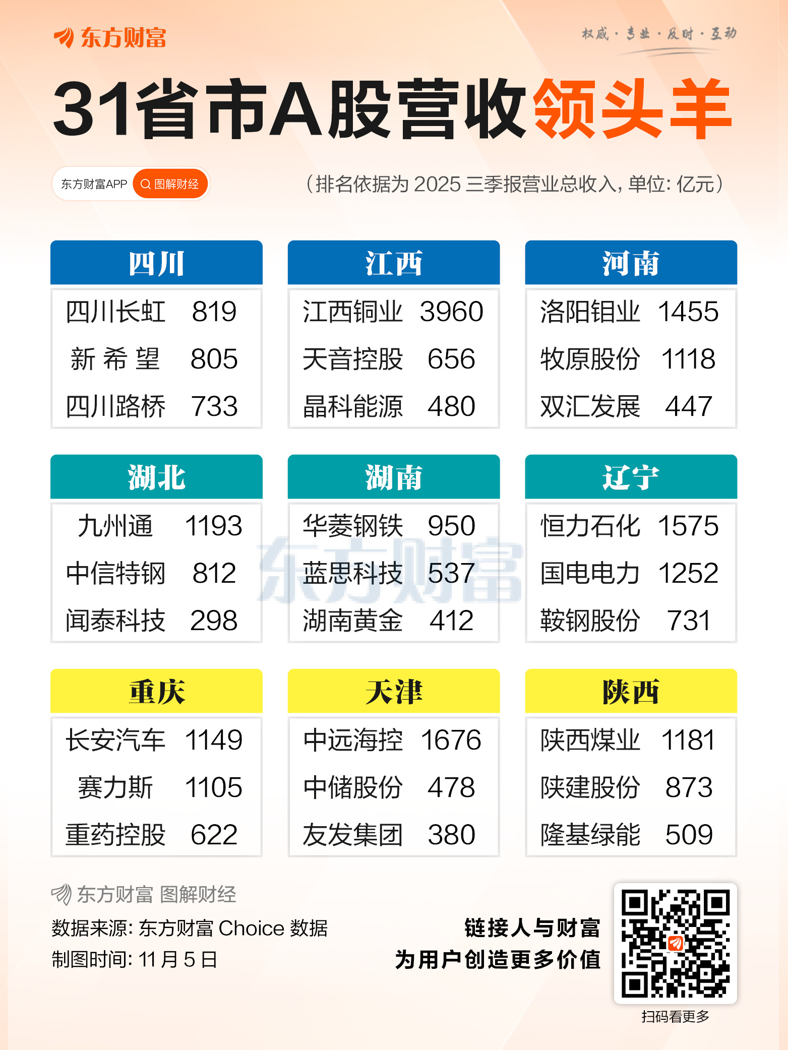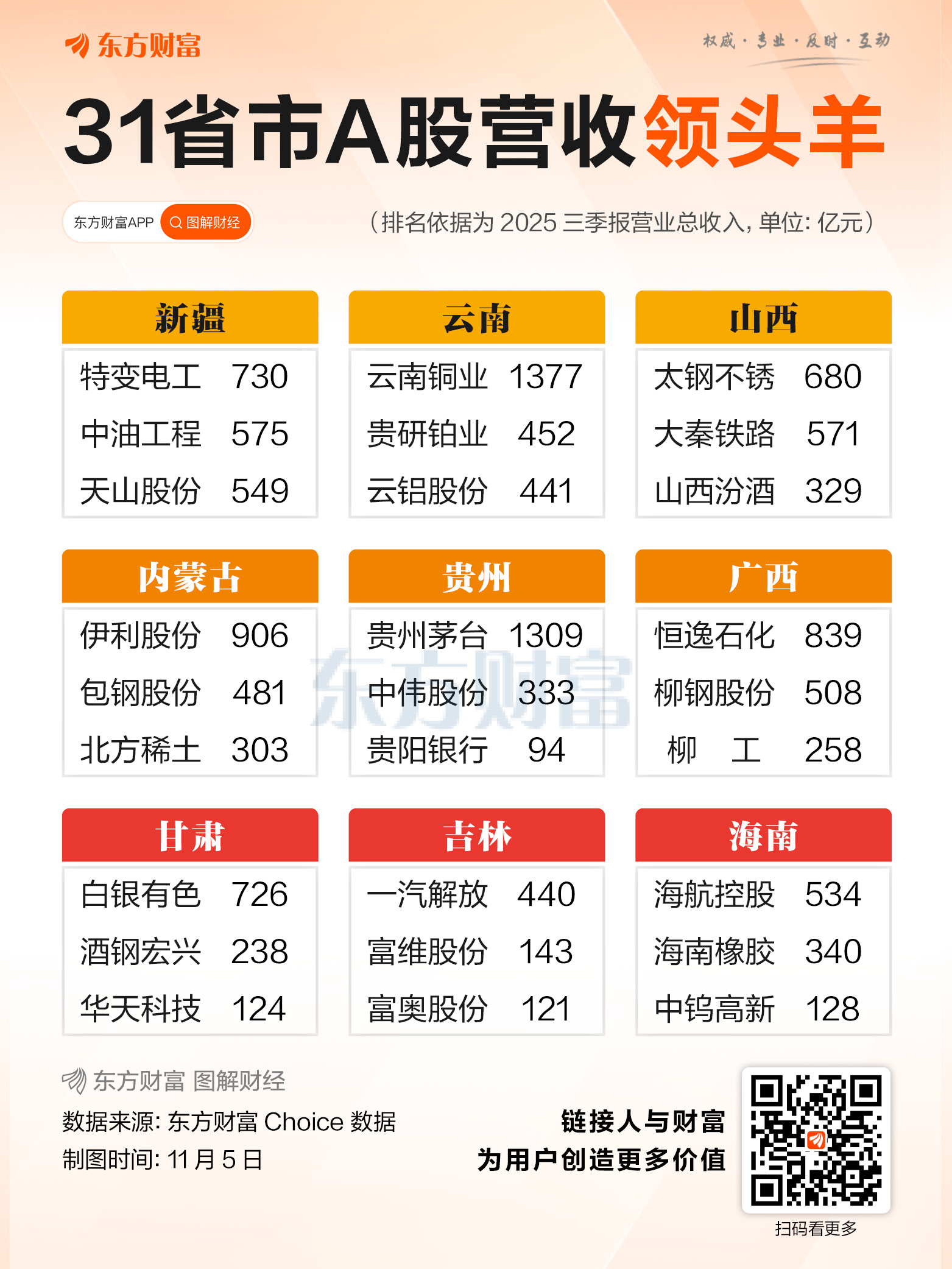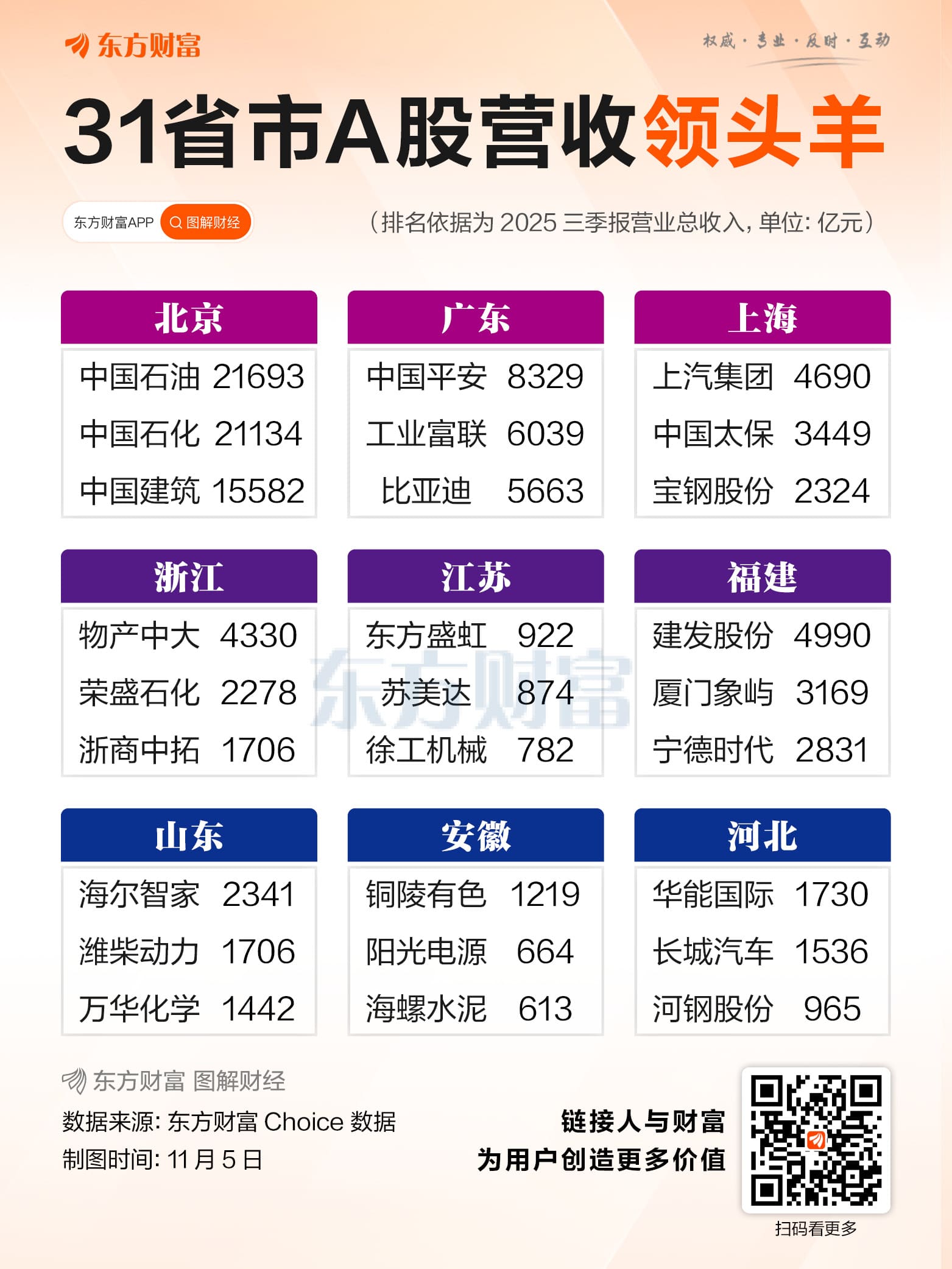 近日,A 股上市公司三季报披露已经收官,本文依据东方财富Choice 数据,筛选出了全国 31 个省市 A 股上市公司总营收前三甲作为 「领头羊」。