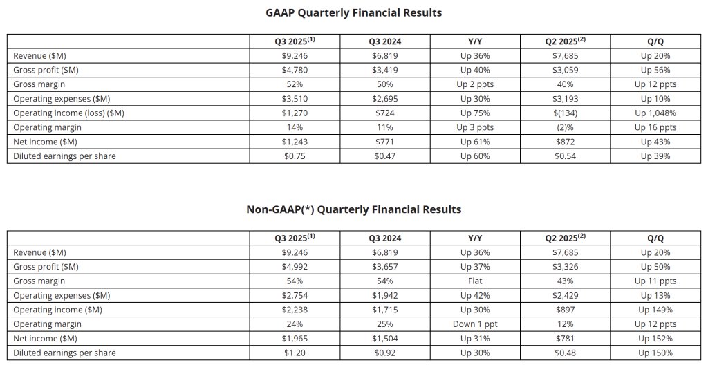 当地时间 11 月 4 日,AMD 公布了截至 2025 年 9 月 30 日的第三季度业绩,报告期间公司营收达到 92.46 亿美元,同比增长 36%,高于市场预期的 87.4 亿美元;美国通用会计准则下 (GAAP) 净利润为 12.43 亿美元,上年同期为 7.71 亿美元,同比大幅增长 61%;Non-GAAP 下每股摊薄收益 1.20 美元,高于市场预期的 1.16 美元。