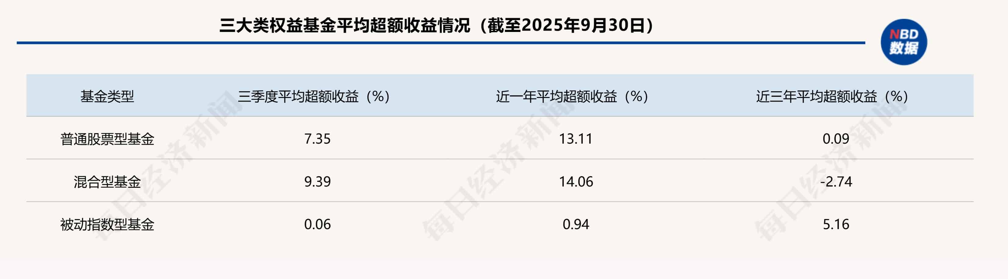 为了让大家更直观地了解基金超额收益情况,《每日经济新闻》 记者选取了以普通股票型基金、混合型基金为代表的主动权益基金,以及全市场被动指数基金,分别统计它们三季度、近一年、近三年平均超越基准收益率的情况 (截至今年 9 月 30 日,下同),结果如下: