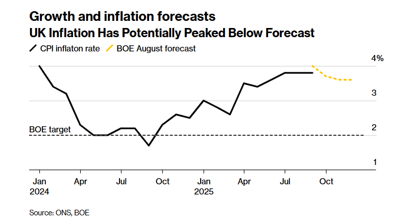 在 9 月份物价增长出人意料地保持在 3.8% 之后,大多数经济学家预计英国央行将下调其近期通胀预测。该央行此前曾预计当月通胀率将达到 4% 的峰值。