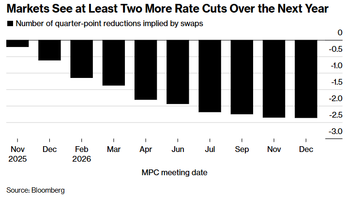 在采取了更为平衡的立场后,贝利可能在 11 月或 12 月的会议上投下决定性一票。虽然这位行长曾表示下一次降息的时机尚不确定,但他警告说,经济运行 「低于其潜力水平」,并指出了就业市场的降温迹象。