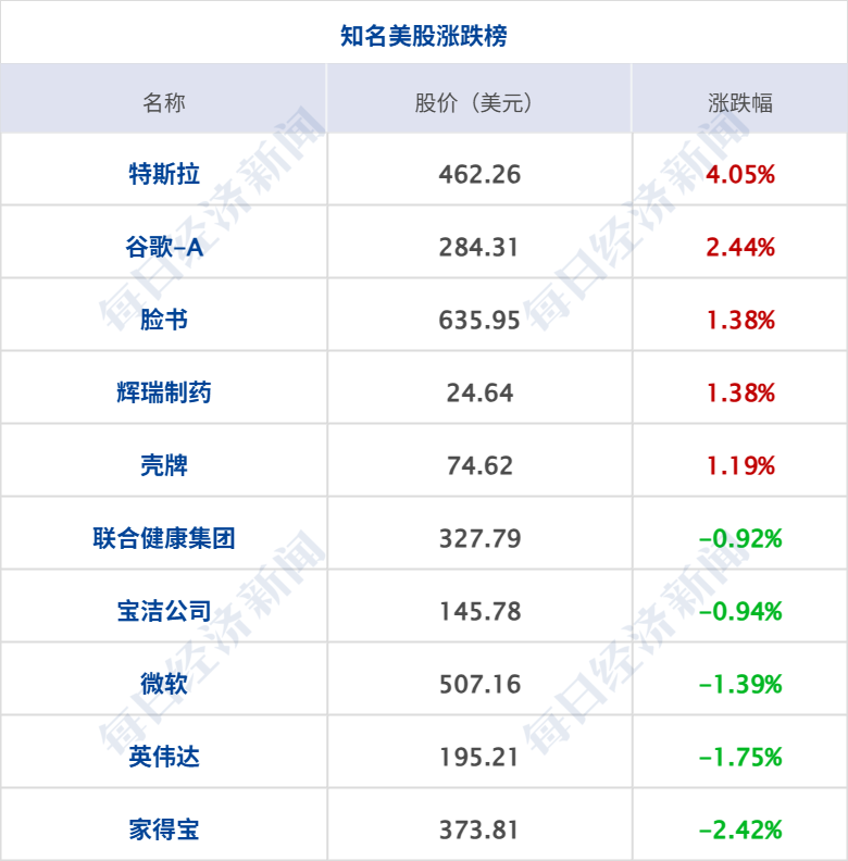 美股三大指数集体收涨,纳指涨 0.65%,道指涨 0.48%,标普 500 指数涨 0.37%;大型科技股多数上涨,谷歌涨超 2%,创历史收盘新高;特斯拉涨超 4%,英特尔涨逾 3%,Meta 涨超 1%,苹果、奈飞、亚马逊小幅上涨;微软、英伟达跌超 1%。纳斯达克中国金龙指数涨 0.15%,中概股涨跌不一,富途控股涨超 4%,唯品会、好未来涨超 2%,蔚来、霸王茶姬涨超 1%,京东、金山云等小幅上涨;再鼎医药跌超 4%,新东方、小鹏汽车跌逾 3%,贝壳、BOSS 直聘跌超 2%,百度跌逾 1%。