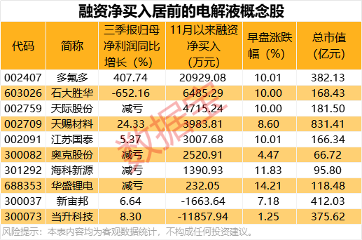 从资金面上来看,11 月以来,8 只电解液概念股获得融资资金加仓,多氟多、石大胜华、天际股份净买入金额居前,分别为 2.09 亿元、6485.29 万元、4715.24 万元。