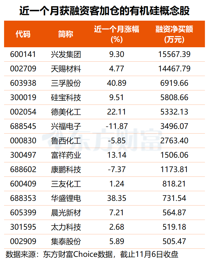 东方财富Choice 数据显示,近一个月以来,共有 14 只有机硅概念股获融资净买入,其中 5 股融资净买额超 5000 万元,兴发集团获融资客抢筹 1.56 亿元,天赐材料融资净买额达 1.45 亿元。