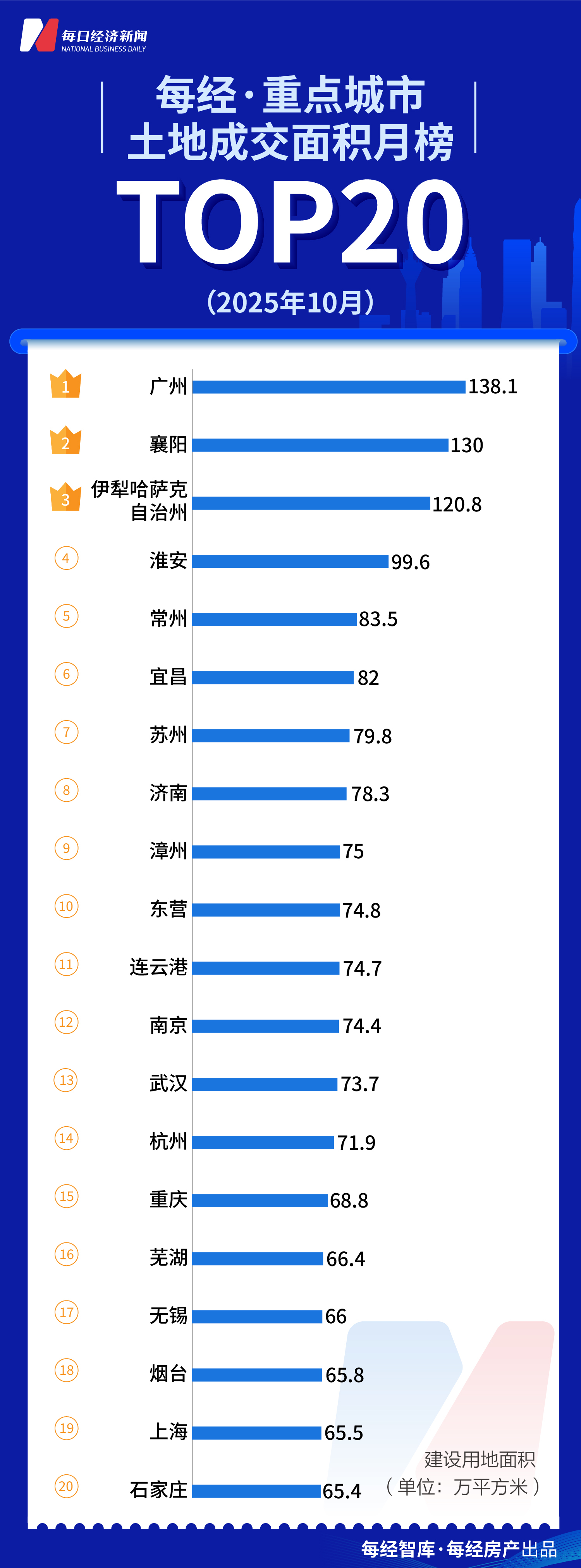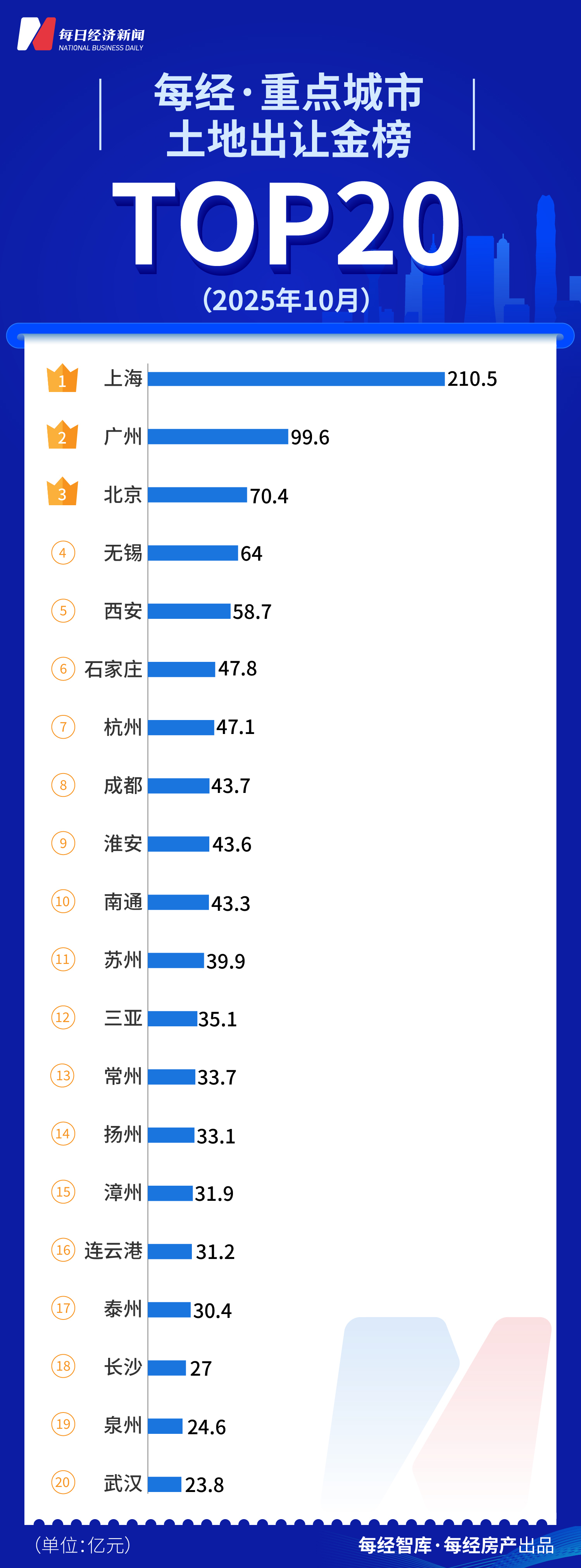 10 月份,土地出让金超过 100 亿元的城市仅有上海,为 210.5 亿元。TOP20 城市土地出让金合计 1039.4 亿元,环比 9 月份稍有回落。据中指研究院统计,房企保持深耕聚焦下,上海、杭州土拍热度持续,成都、青岛优质地块举牌意愿较高。