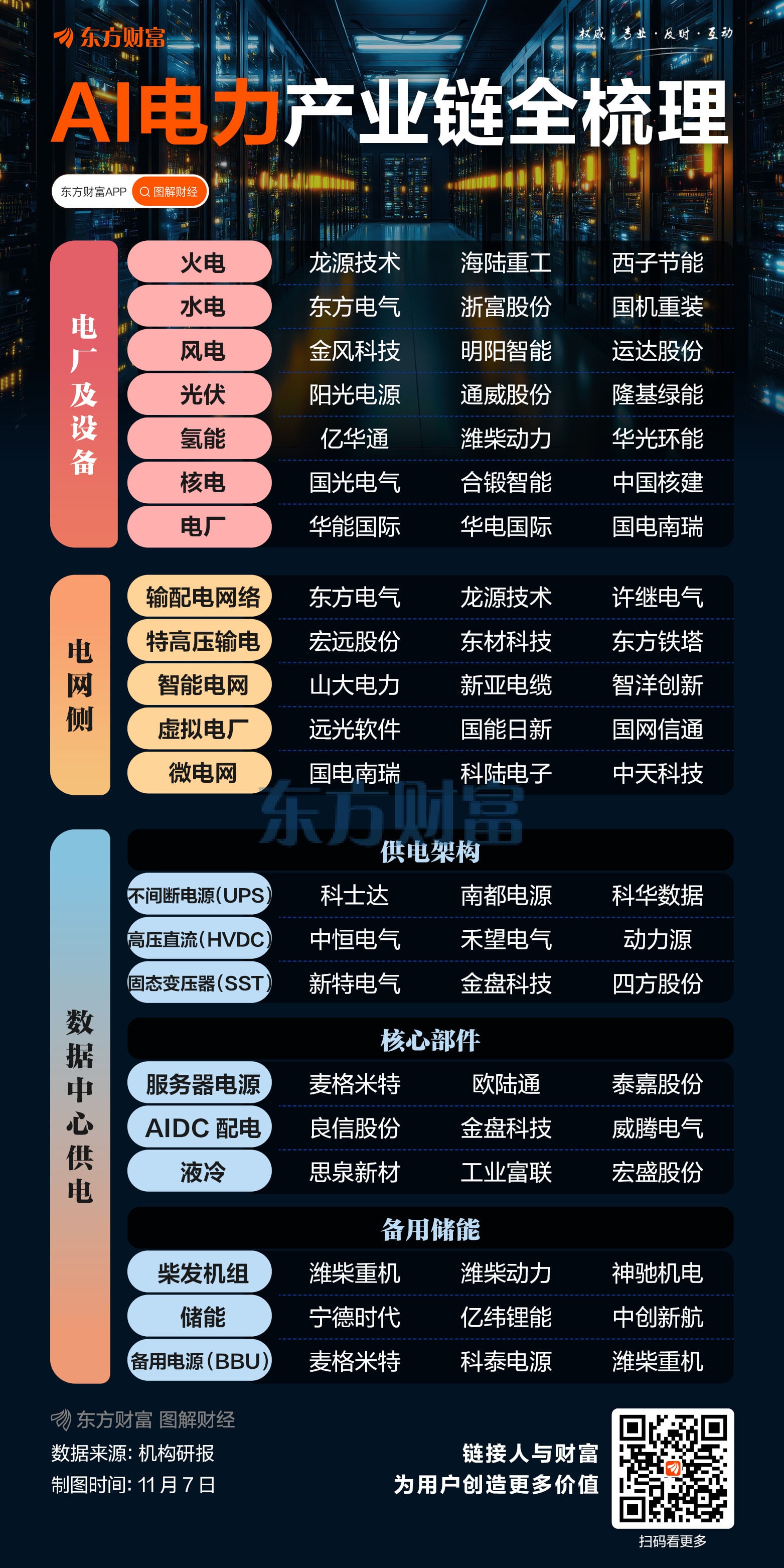 因此,本文梳理了 AI 电力产业链。所谓 AI 电力产业链,其本质是为了满足 AI 算力指数级增长带来的巨大、稳定、高质量的电力需求,而从能源生产端到消费端进行的一系列升级和变革。简单可分为发电侧、电网侧和用电侧 (数据中心供电)。
