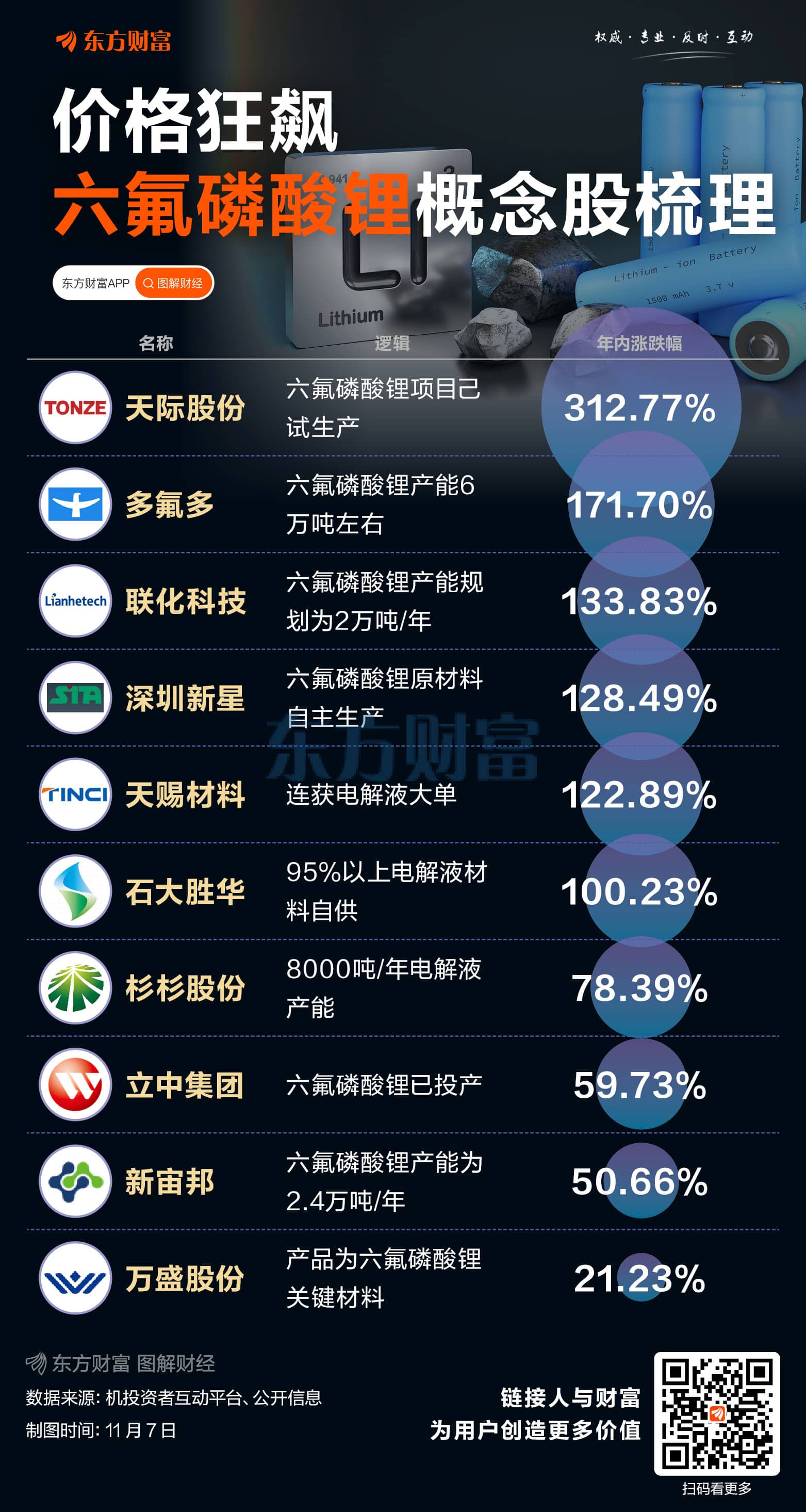 周五 (11 月 7 日) 电解液及其关键材料六氟磷酸锂概念股表现强势,多氟多、联化科技、深圳新星、天际股份涨停,天赐材料大涨超 9%,新宙邦、石大胜华、万盛股份等强势跟涨。