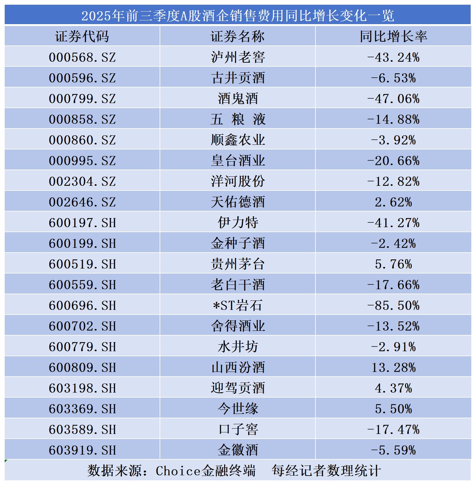 具体来看,*ST 岩石销售费用同比降幅最大,达 85%;头部酒企中,泸州老窖降幅领跑,同比下滑 43.24%,五粮液、洋河股份、古井贡酒则分别同比下滑 14.88%、12.82%、6.53%,降本力度尤为明显。
