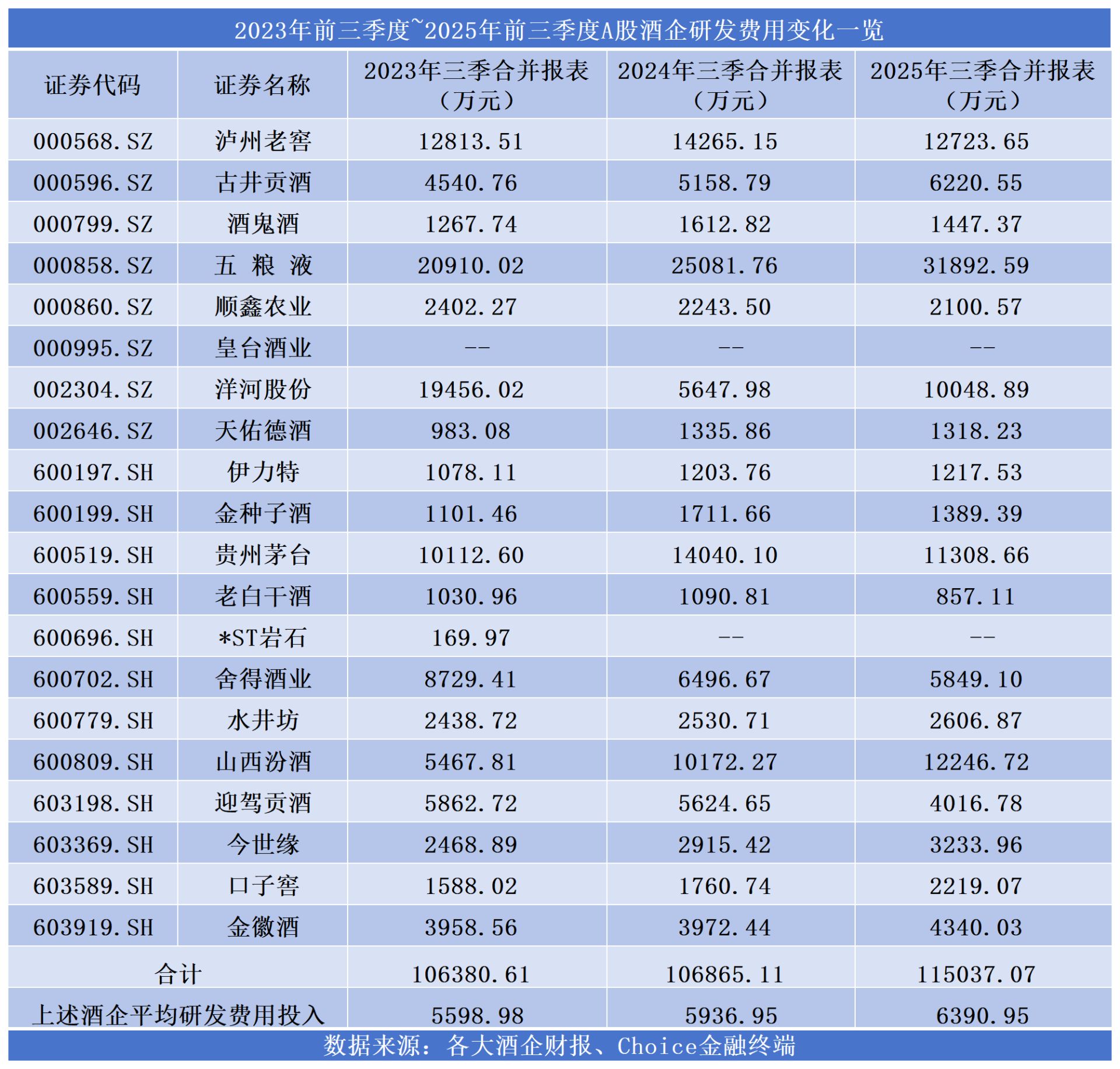 《每日经济新闻·将进酒》 记者梳理发现,2023 年前三季度~2025 年前三季度,20 家 A 股酒企累计研发费用呈不断增长趋势。其中,2025 年前三季度,18 家 A 股酒企累计研发投入达 11.5 亿元,同比增长 7.65%;每家企业平均研发费用投入达 6390.95 万元。