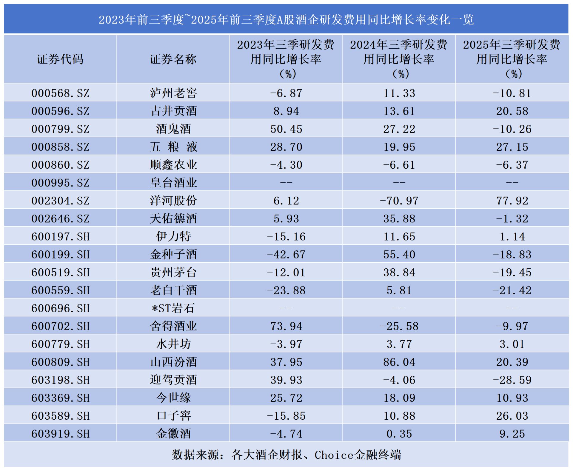 此外,2023 年前三季度~2025 年前三季度,18 家 A 股酒企中,研发费用同比正增长的企业分别为 9 家、14 家、9 家。而今年前三季度,洋河股份、五粮液、古井贡酒、山西汾酒等均实现超 20% 的同比增长。