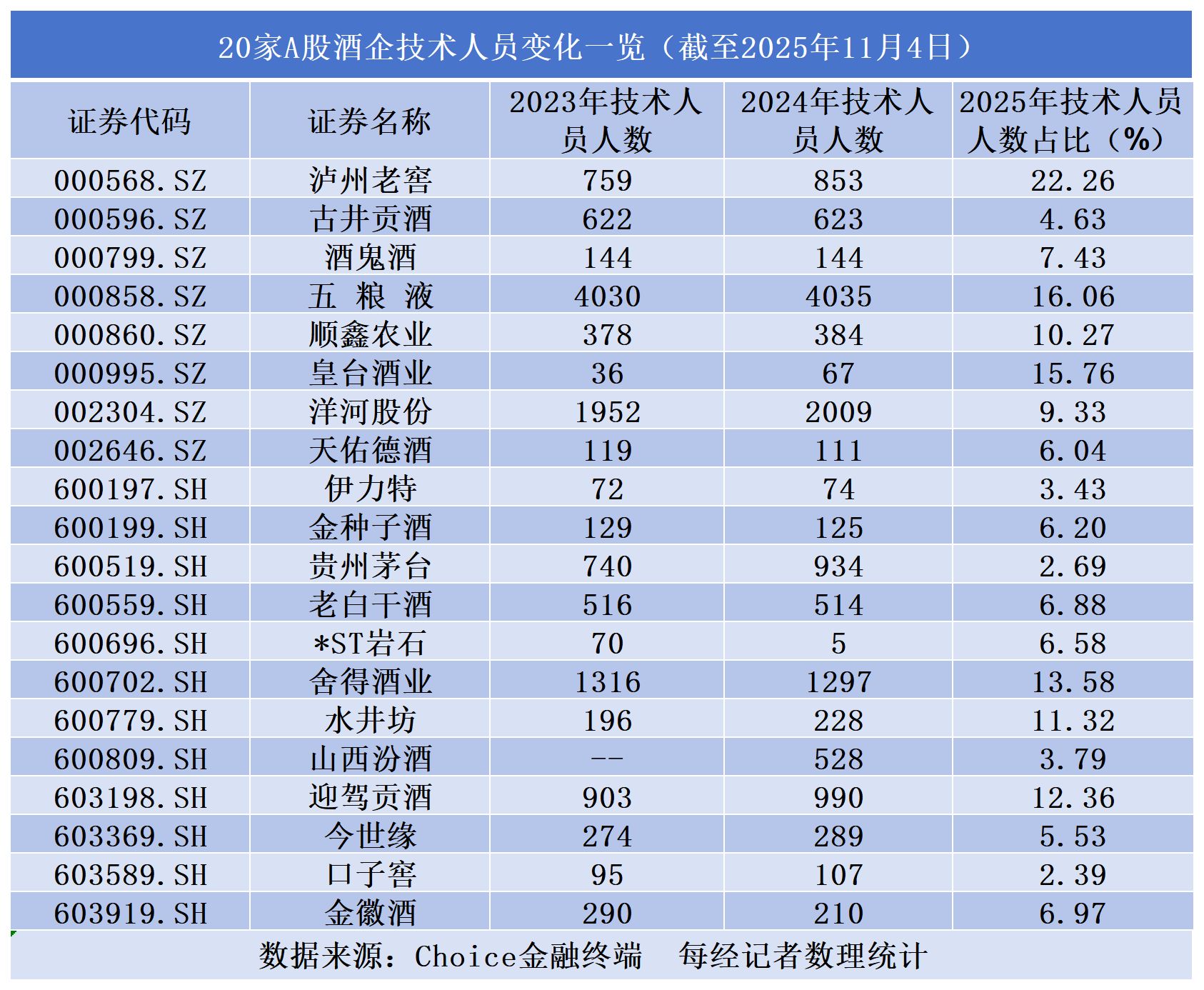 据 《每日经济新闻·将进酒》 记者不完全统计,2024 年有超六成的酒企技术人员同比实现增长。其中,五粮液、洋河股份、舍得酒业的技术人员分别达到 4035 人、2009 人、1297 人。截至 2025 年 11 月,20 家 A 股酒企中有 7 家酒企技术人员占比超 10%,而泸州老窖技术人员占比超 20%,五粮液技术人员占比超 15%。