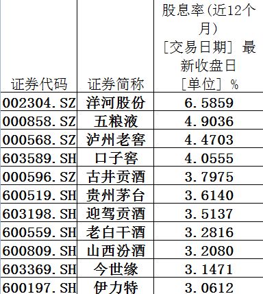 另一方面,《每日经济新闻·将进酒》 记者通过数据统计发现,截至 11 月 4 日,已有 11 家白酒企业近 12 个月股息率超过 3%。其中,洋河股份股息率高达 6.59% 居首;五粮液、泸州老窖以及口子窖的股息率也均超过 4%。