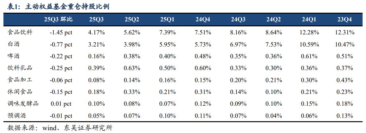 整体来看,2025 年三季度白酒延续减配趋势,主动权益基金持仓比例环比减少 0.77 个百分点至 3.21%。近 5 个季度,白酒主动基金持仓比例分别为 6.97%、5.73%、5.95%、3.98%、3.21%。另一方面,主动权益基金对白酒的整体超配比例环比也均有显著下滑,从超配比例来看,2024 年三季度到 2025 年三季度,白酒单季度超配比例分别为 2.99%、2.34%、2.56%、1.12%、0.60%。