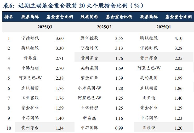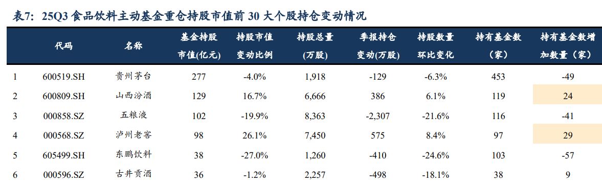 从具体个股来看,主动权益基金的白酒持股倾向对出清、企稳预期更明确的标的进行配置。截至 2025 年三季度末,主动权益基金重仓持股市值排名中,贵州茅台虽然排名有所下降,但仍是食品饮料上市公司中唯一稳居前 20 的重仓股。