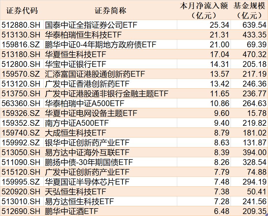 截至 11 月 6 日,本月资金净流入额居前 20 的 ETF 名单如下: