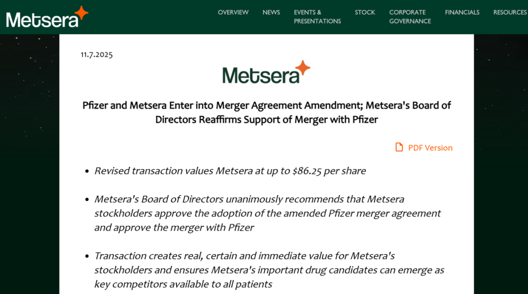 【导读】 辉瑞与 Metsera 达成合并协议修正案,修订后交易对 Metsera 估值高达每股 86.25 美元