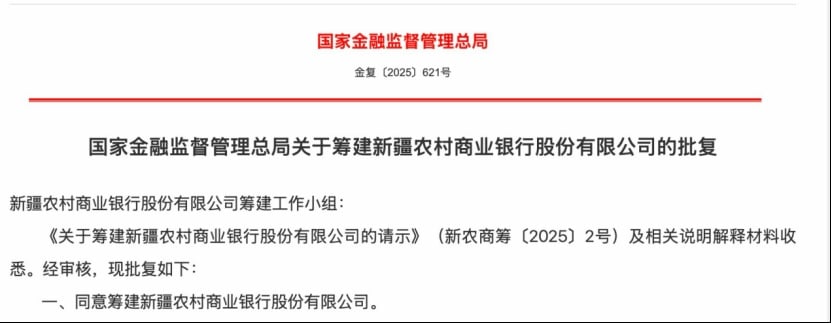 11 月 7 日,国家金融监督管理总局发布批复显示,监管已同意筹建新疆农村商业银行(以下简称 「新疆农商银行」)。