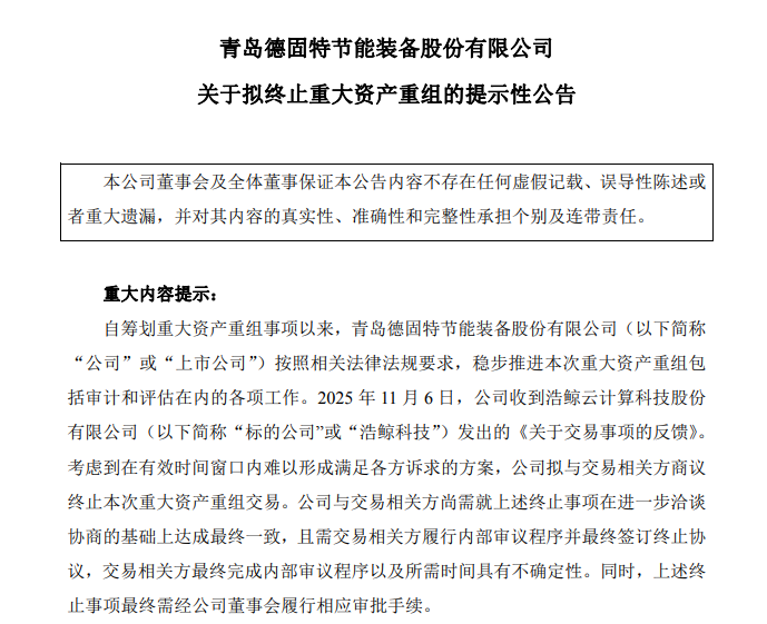 公告显示,德固特于 11 月 6 日收到浩鲸科技发出的 《关于交易事项的反馈》,其主要股东方对本次重组的核心条款存在分歧,且在有效时间窗口内难以形成满足各方诉求的方案。为维护公司及股东利益,德固特决定与交易相关方商议终止本次交易。