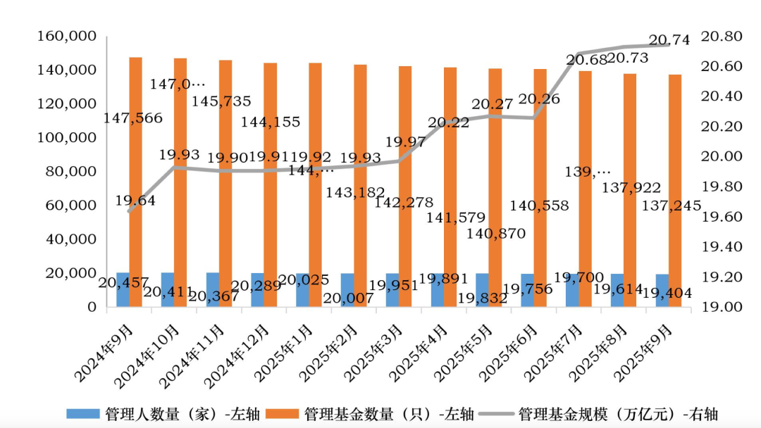 截至 9 月末,存续私募基金规模 20.74 万亿元。其中,存续私募证券投资基金规模为 5.97 万亿元,相较于 8 月末再度增加。