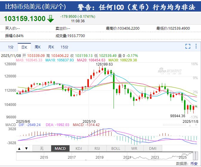 在经历了一周的下跌后,比特币价格在当地时间 11 月 7 日尾盘企稳反弹,价格回升至 10.3 万美元上方,但仍较 10 月 6 日创下的 12 万美元纪录高点下跌约 18%。