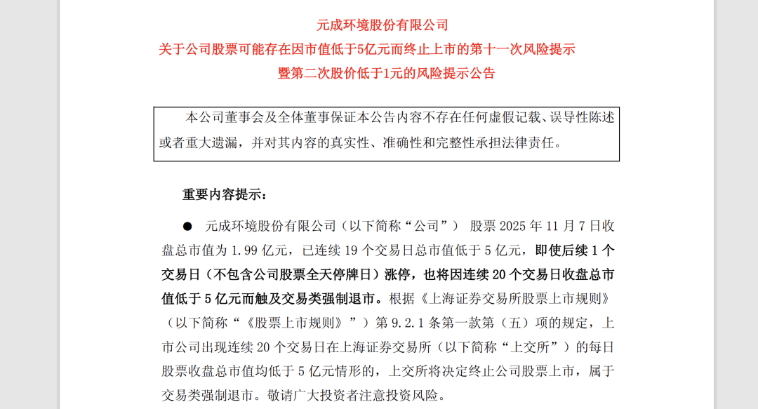 此外,*ST 元成股价已连续 10 个交易日低于 1 元。即使后续 10 个交易日 (不包含公司股票全天停牌日) 连续涨停,也将因连续 20 个交易日收盘总市值低于 5 亿元而触及交易类强制退市。