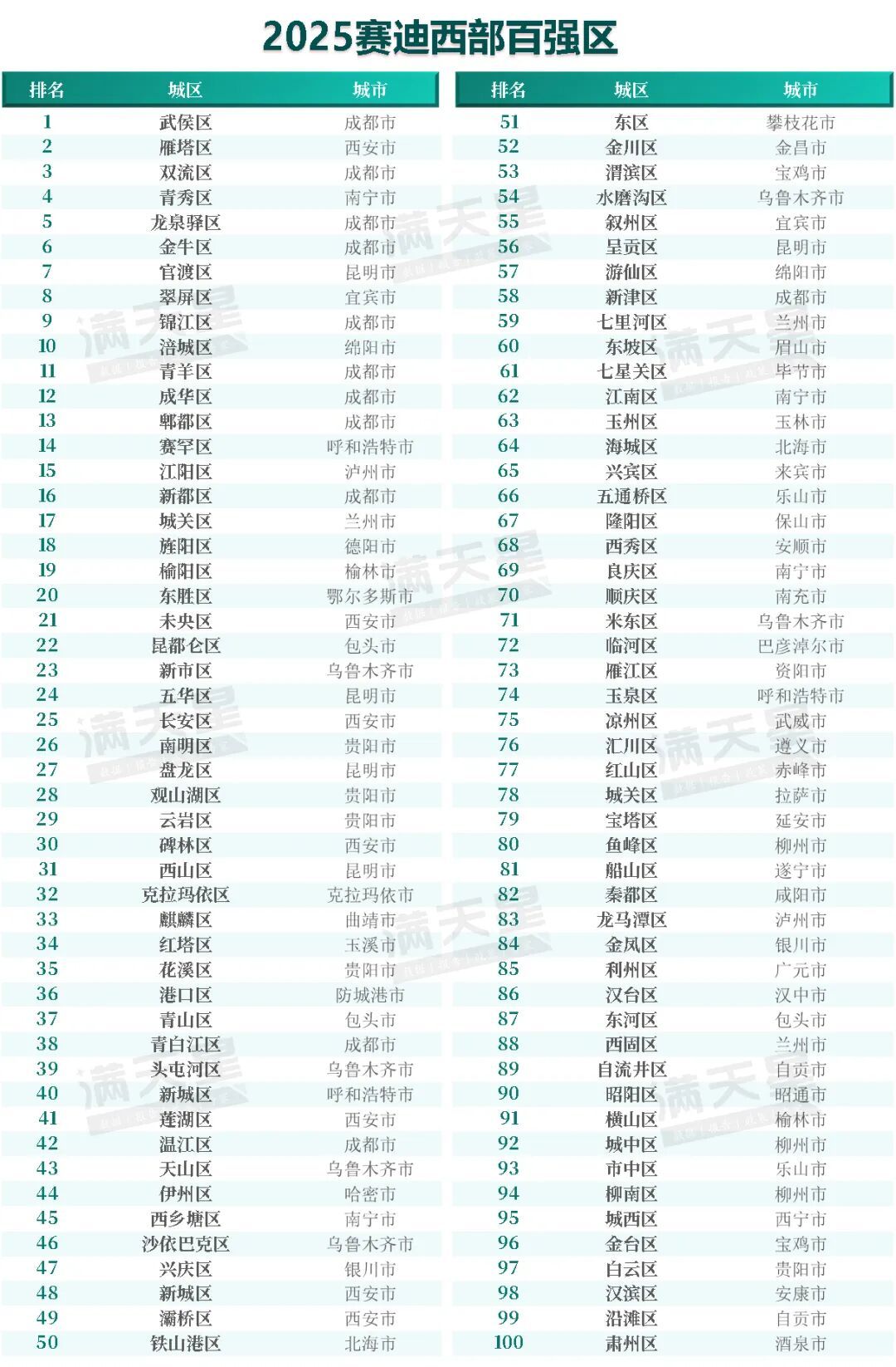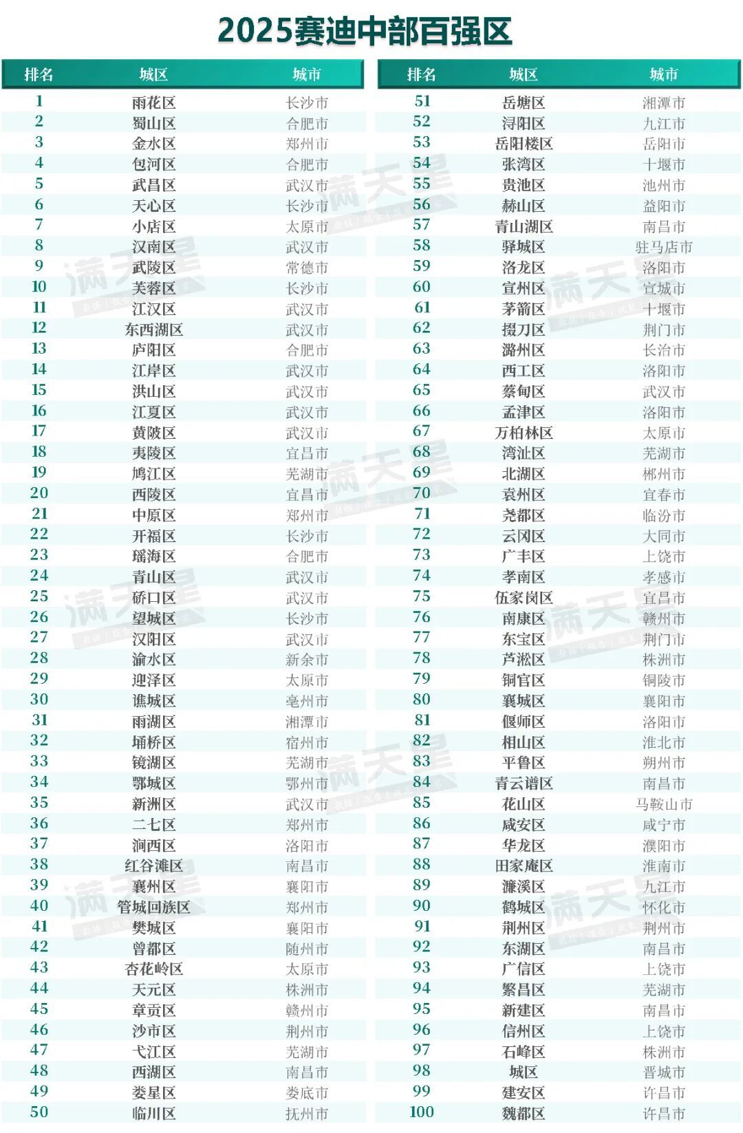 2025 中西部百强区:长沙市雨花区、成都市武侯区分居榜首