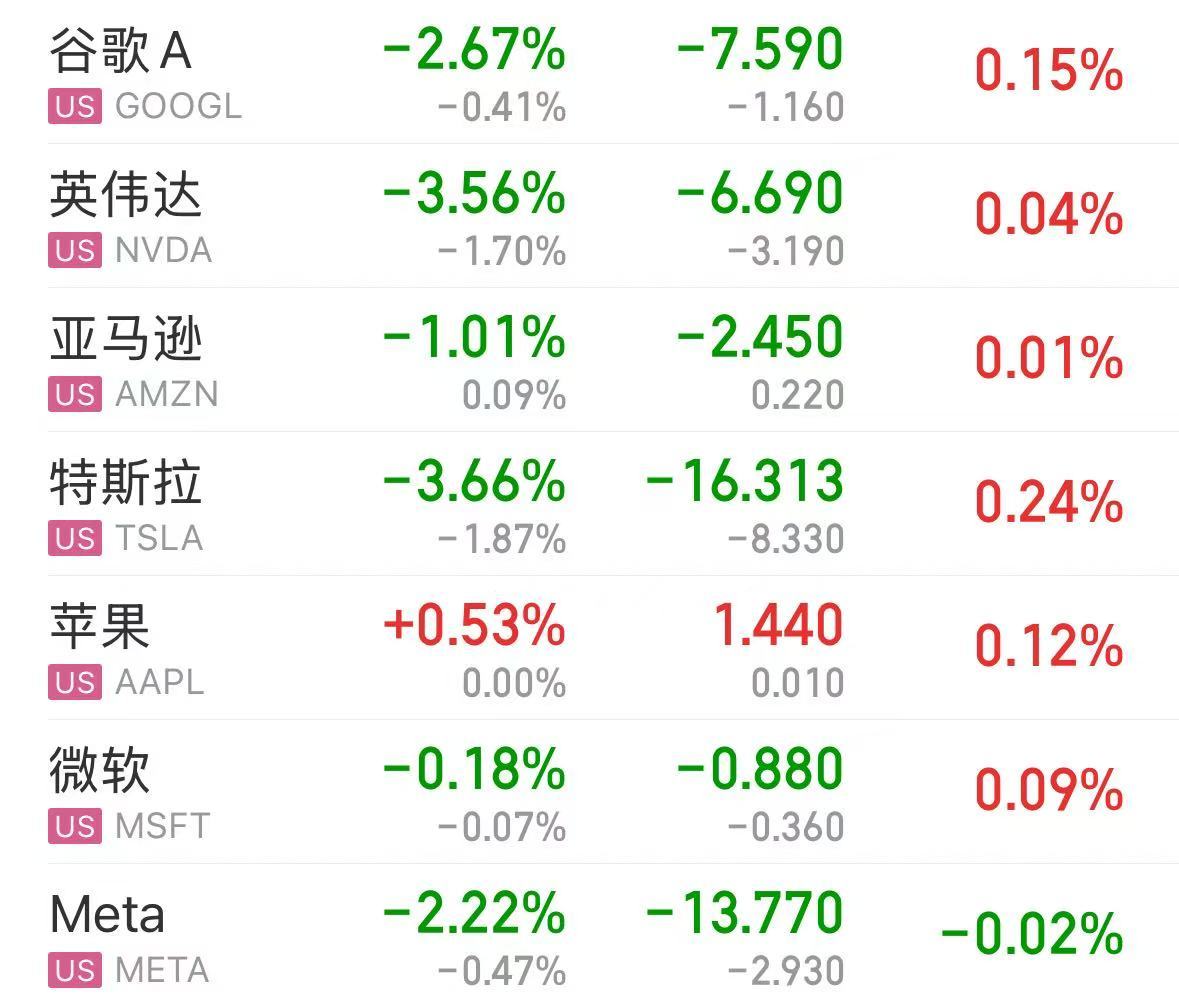 大型科技股多数下跌,英伟达、特斯拉跌超 3%,谷歌、Meta 跌超 2%,亚马逊跌超 1%,微软下跌 0.18%,苹果上涨 0.53%。