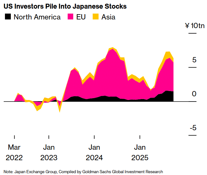 高盛集团分析显示,在日本股市回报率显著超越美股的吸引下,美国投资者正持续加仓聚焦科技与人工智能领域的日本股票。