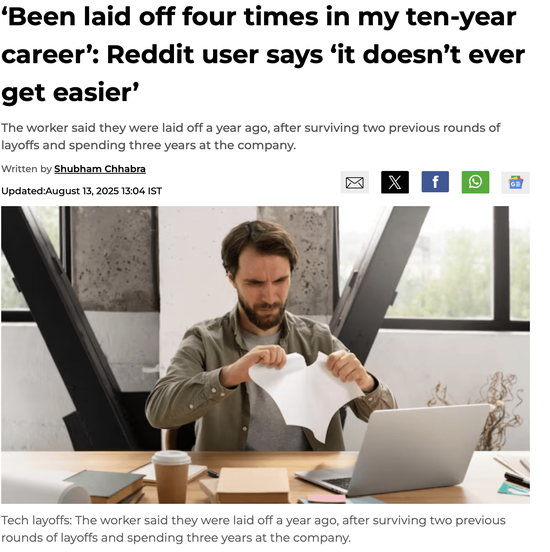 一位在十年职业生涯中经历四次裁员的科技员工在 Reddit 上分享了反复失业带来的情感和心理影响。」 每次自己都被告知』 这不是你的问题,只是商业决定』,」 他说,」 但当你看到自己的岗位被保留下来,甚至同事还能获得晋升,你很难不感到被背叛。」 他现在依然受到精神焦虑与缺乏自信的困扰。